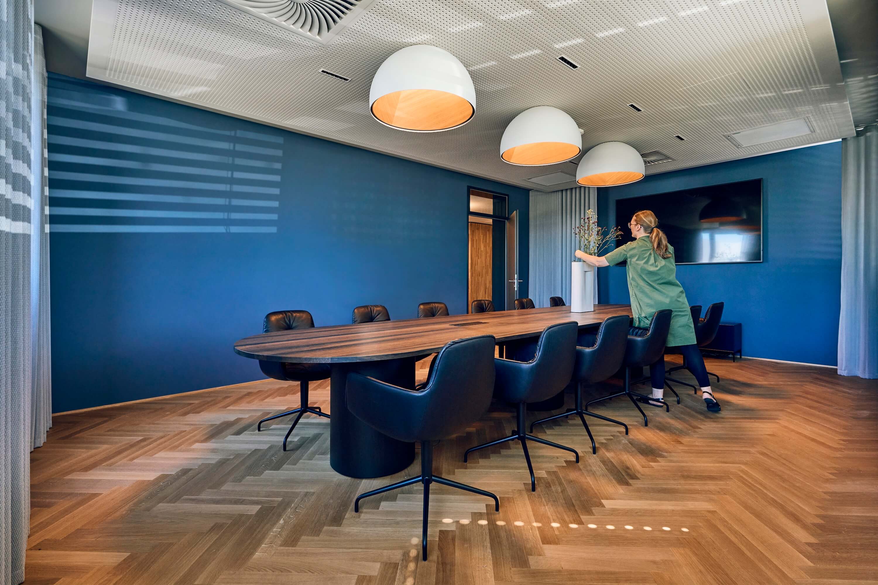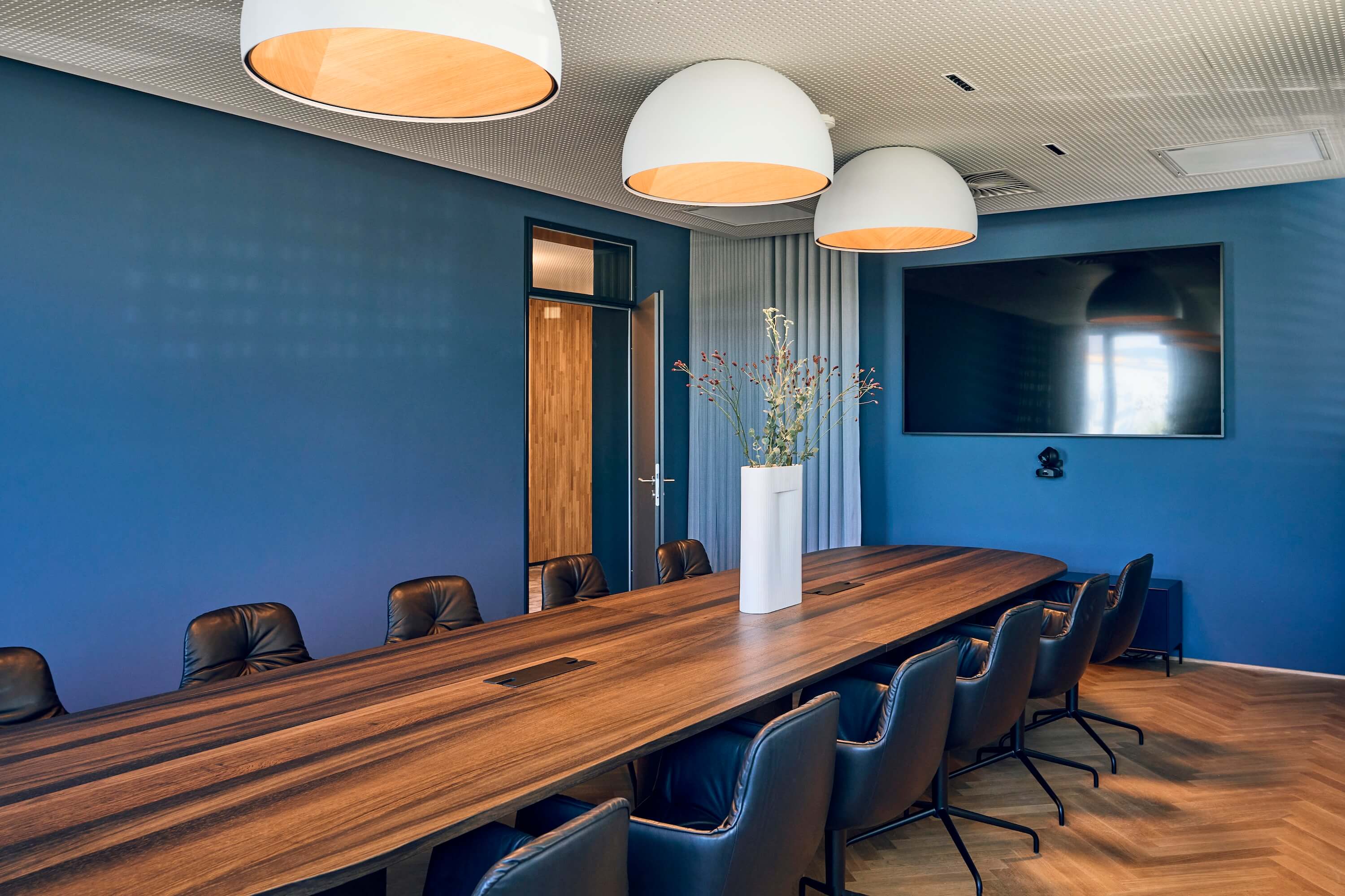 Der Konferenzraum bildet den geschützten, zentralen Bereich des Family Offices. Die Arbeitsplätze präsentieren sich filigran und leicht, folgen aber dem warmen Farbkonzept, das sich wie ein roter Faden durch die gesamten Räumlichkeiten zieht. Ein wenig fühlt man sich an eine Bibliothek oder ein Kaminzimmer erinnert, hier ist dies jedoch zeitgemäß interpretiert worden.