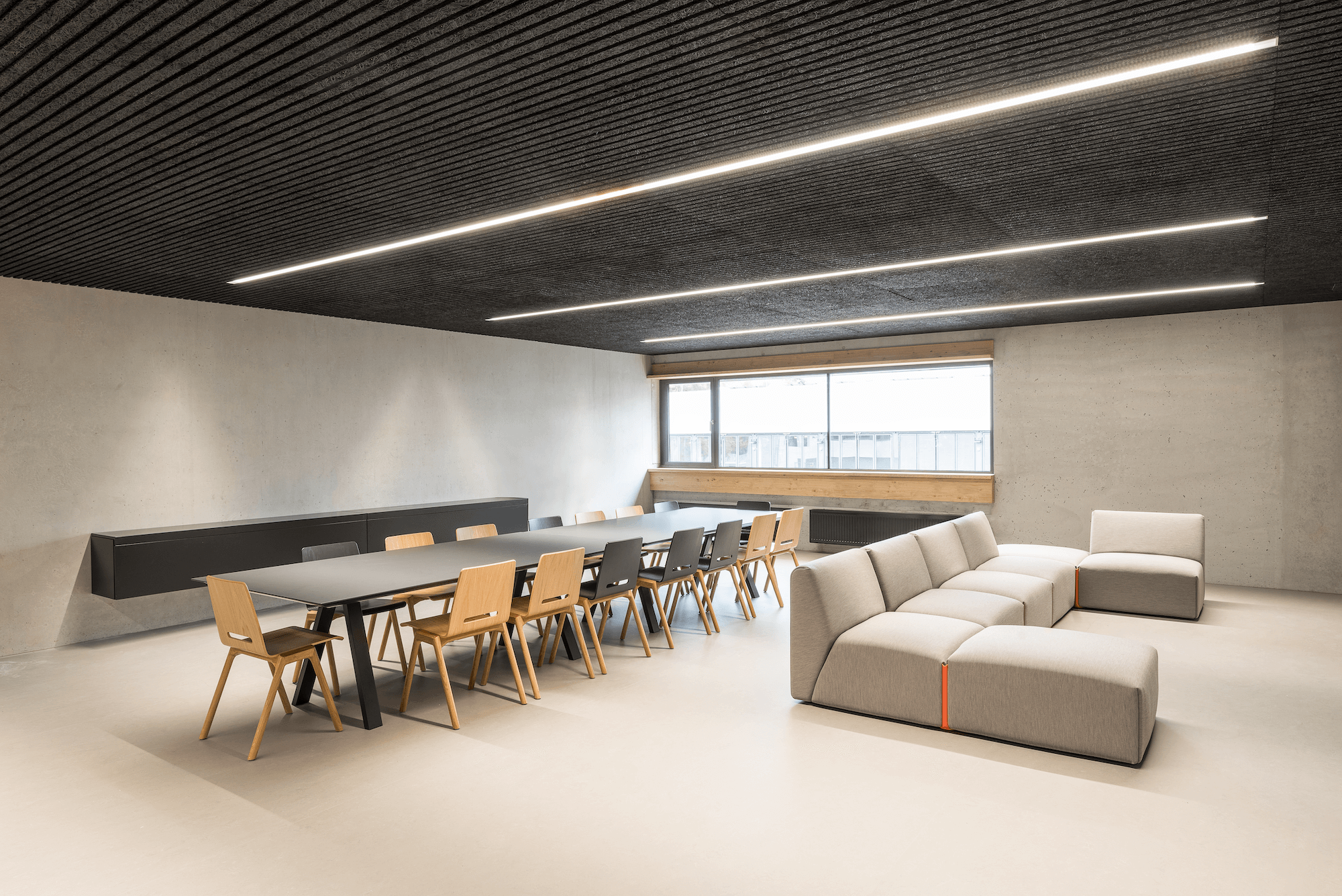 Auch bei allen anderen Verwaltungs- und Seminarräumen bieten die Einbauten aus Eiche in Kombination mit der Materialität der Möbel eine harmonische natürliche Ergänzung zum Baukörper.