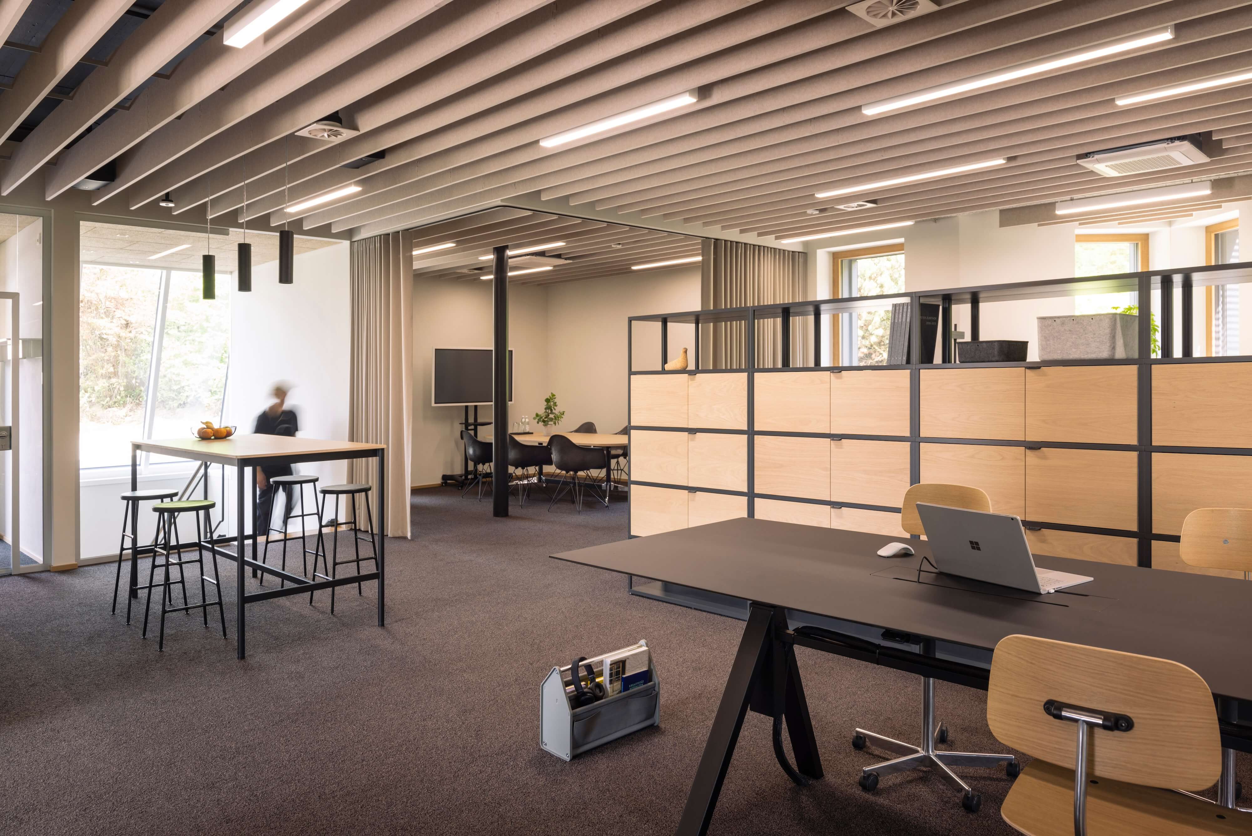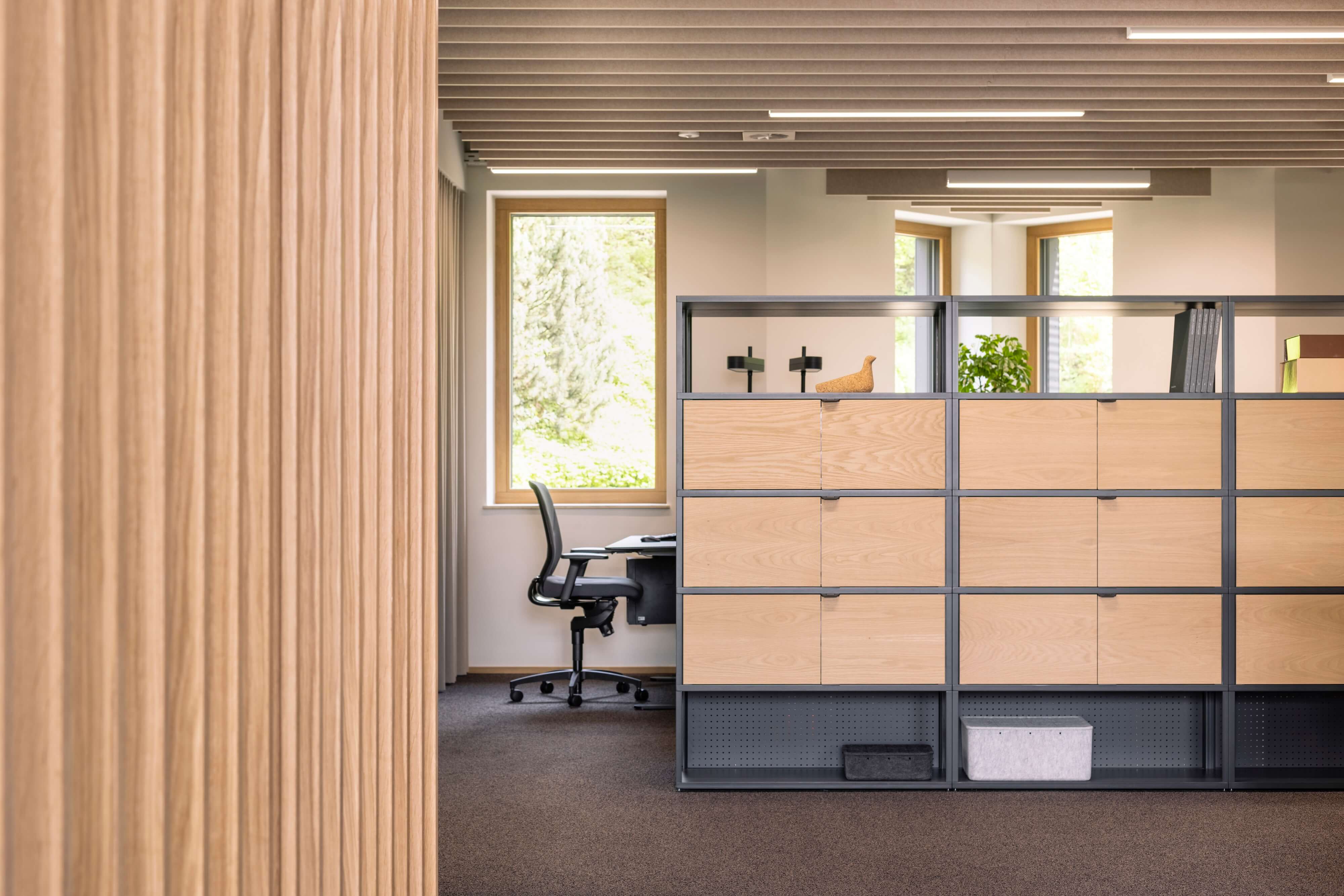 Ein zentrales Schranksystem sorgt für ein Maximum an Ordnung im Raum und bildet zugleich eine optische und akustische Abgrenzung für die dahinter angeordneten Arbeitsplätze.