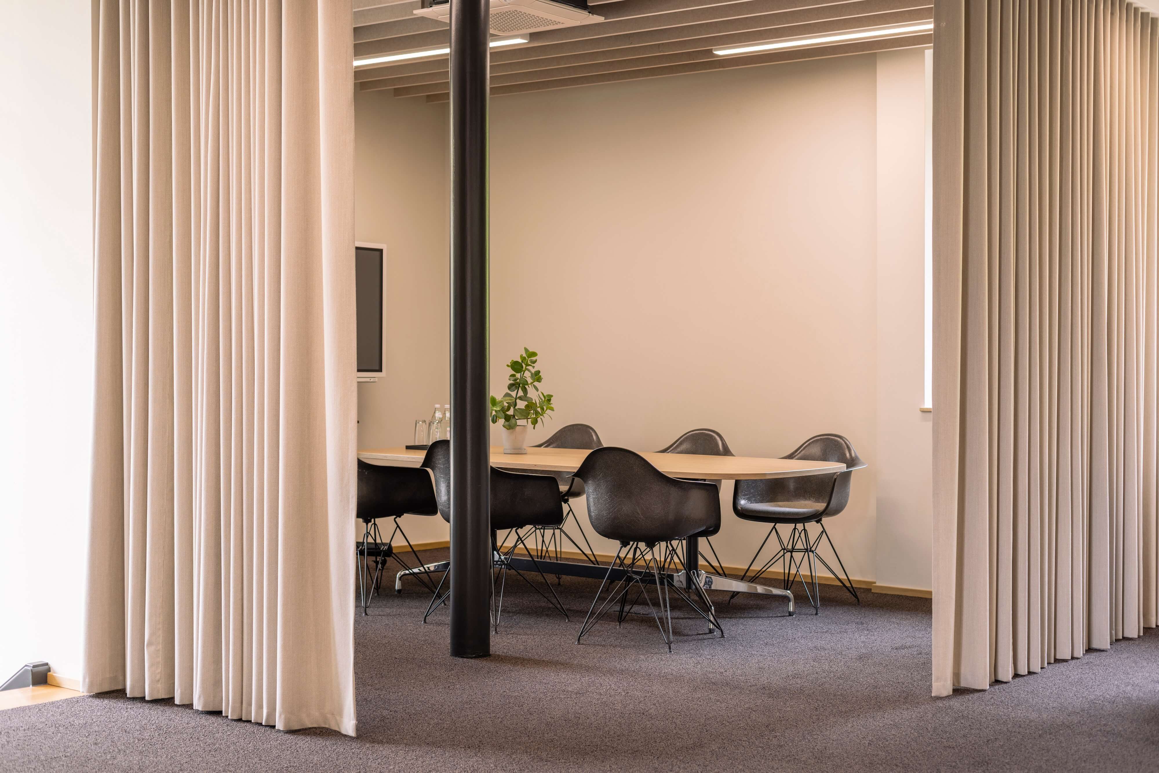 Im Inneren verbergen sich offene, lichte Räume, die durch Glaskubaturen in sich unterteilt sind und zusätzlich durch ein Vorhangsystem geschickt zoniert werden können.